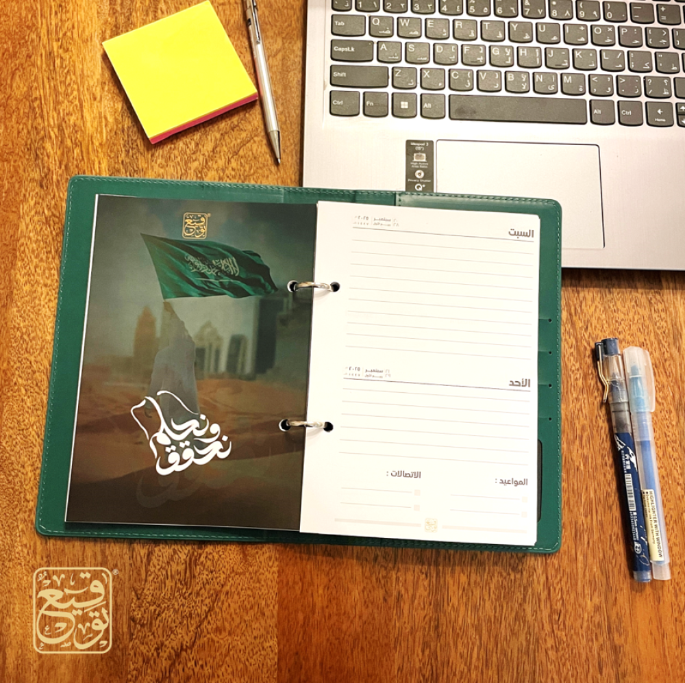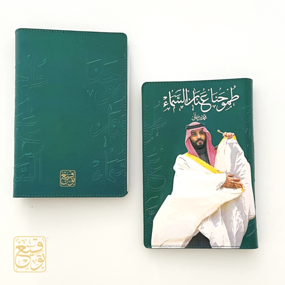 ابدأ كل يوم بإلهام يلامس عنان السماء! نقدم لك أجندة دفتر اليوميات المميزة التي تجمع بين التنظيم العملي والروح الوطنية الملهمة. يتميز هذا الدفتر بتصميم أنيق وعصري، وتتزين واجهته بصورة صاحب السمو الملكي الأمير محمد بن سلمان، قائد رؤية المملكة الطموحة، مع عبارته الشهيرة والمحفزة "طموحنا عنان السماء".